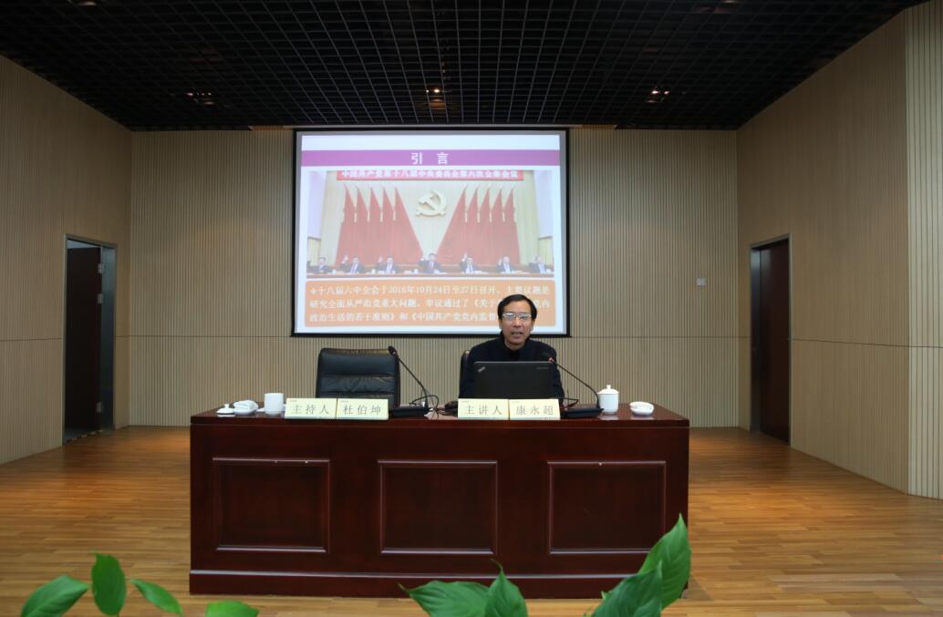 隨后,常州市委黨校理論研究中心主任康永超教授應邀為全體黨員和領(lǐng)導干部作了《開啟全面從嚴治黨新征程》的宣講,他通過對“六中全會的總體定位與鮮明特點”、“全會對習近平核心地位的明確”、“《準則》和《條例》的基本要求”這三個問題的解讀,幫助黨員和領(lǐng)導干部進一步理解全面從嚴治黨的重要性和必要性,理解《關(guān)于新形勢下黨內(nèi)政治生活的若干準則》和《中國共產(chǎn)黨黨內(nèi)監(jiān)督條例》的基本要求。