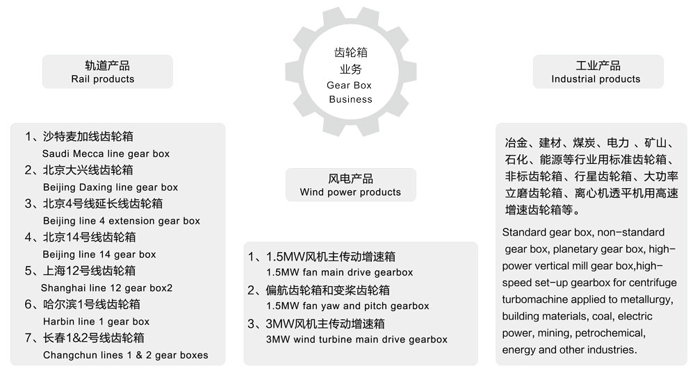 冶金、建材、煤炭、電力、礦山、石化、能源等行業用標準齒輪箱、非標準齒輪箱、行星齒輪箱、大功率立磨齒輪箱、離心機透平機用高速增速齒輪箱等。
